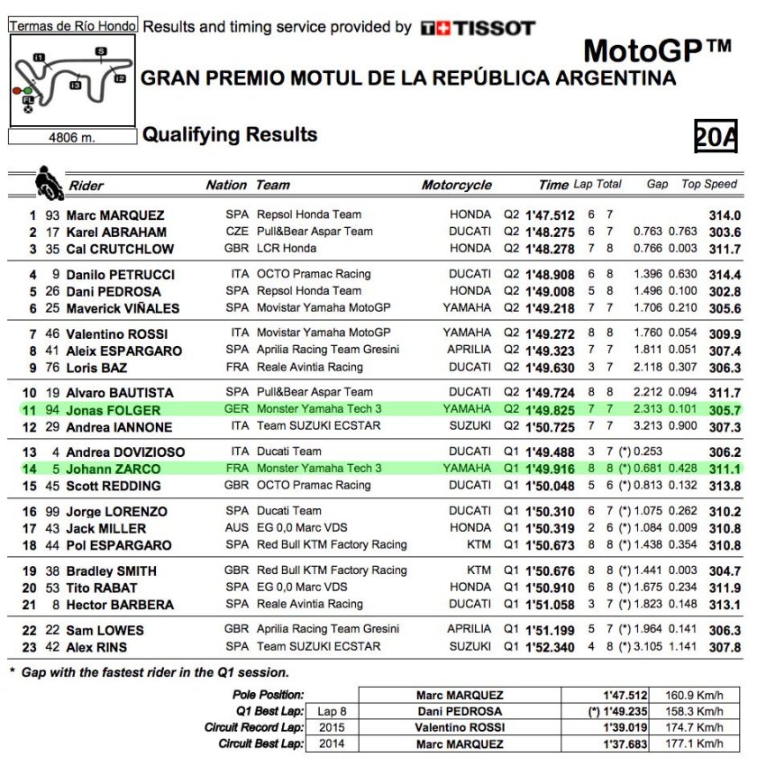 Yang cukup membuat kaget di Argentina adalah terlemparnya pebalap-pebalap top dari jajaran tiga besar bro sis. Duo Movistar Yamaha, Vinales dan Rossi hanya puas berada di posisi enam dan tujuh secara berurutan. Sedangkan posisi dua dan tiga diisi oleh Karel Abraham dari tim satelit Ducati dan juga Cal Crutchlow pebalap LCR Honda. Yang cukup mengherankan juga adalah gap waktu antara duo Yamaha dan Marquez. Akibat trek yang tricky karena setengah hujan setengah kering, duo Yamaha tersebut hanya mampu mencatatkan laptime terbaik di angka 1m.49 detikan. Artinya keduanya berselisih waktu hingga 1.7 detikan di belakang Marquez.