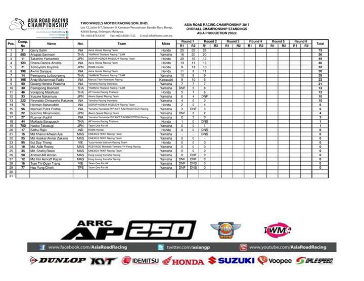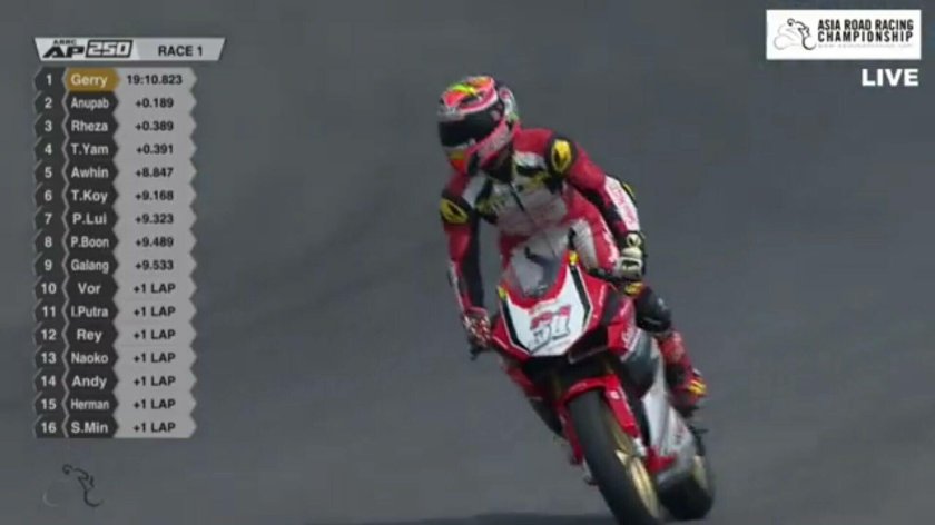 Motomazine.com – Salam safety riding bro sis… Gelaran balap Asia Road Racing Championship (ARRC) ronde kedua di sirkuit Buriram Chang Thailand baru saja mentasbihkan Gerry Salim sebagai pemuncak podium di kelas Asia Production 250cc. Pemuda asal Surabaya itu berhasil menyisihkan lawan-lawan beratnya seperti Yamamoto (JPG) dan Sarmoon (THA) untuk melenggang menggapai podium tertinggi.
