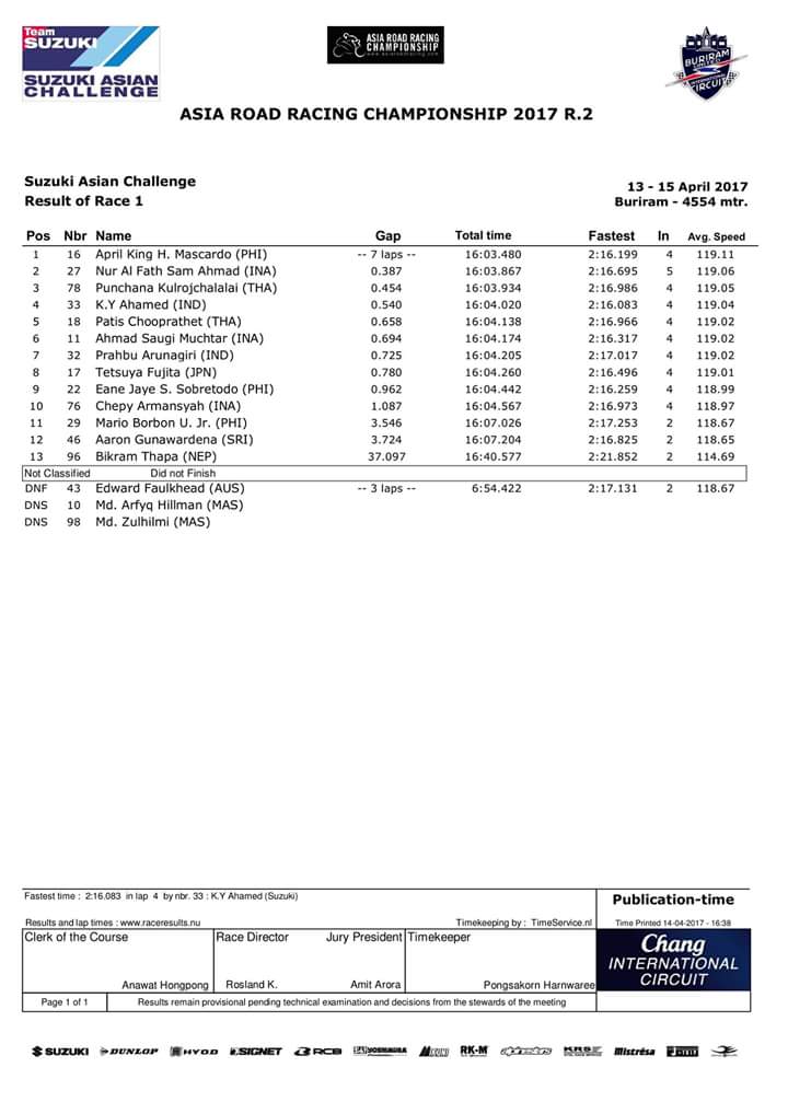 Prestasi gemilang Al Fath ini sejatinya bukan tak semudah membalikkan tangan bro sis.. Pasalnya bersenjatakan motor yang sama dengan kemampuan yang rata-rata setara otomatis faktor keberuntungan dan settingan “lebih pas” dibanding lawan tentu bisa menjadi kunci demi meraih kemenangan. Dan benar saja, terus berjibaku hampir selama race berlangsung, akhirnya menempatkan pebalap asal Makassar tersebut di podium. Sebab jika bro sis ikut menyimak jalannya balapan SAC seri kedua Chang Buriram tadi, hampir sepanjang balapan berlangsung, ada lah jika sekitar 12-an pebalap terus berebut posisi terdepan. Begitupun dengan pebalap-pebalap andalan Suzuki dari Indonesia. Tak hanya Al Fath, Ahmad Saugi maupun Chepy Firmansyah pun bergantian memimpin balap. Namun sangat disayangkan, di akhir balapan kedua racer indonesia tersebut harus rela terisih dan hanya mengecap posisi 6 dan 10.