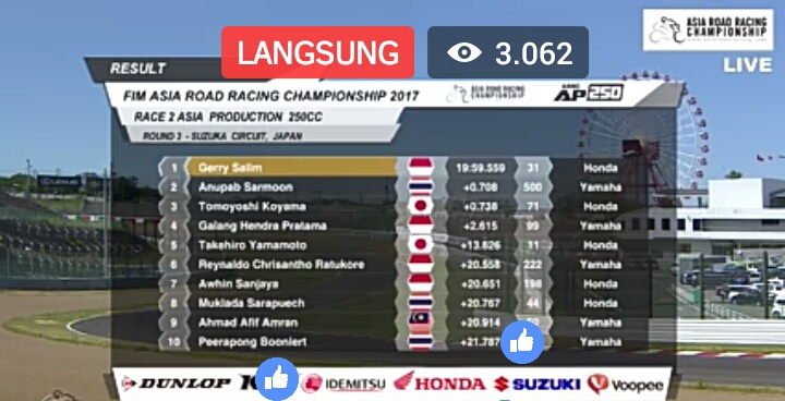 Last.. Gerry Salim akhirnya kembali keluar sebagai juara seri race 2 kelas AP250 balap ARRC 2017 di sirkuit Suzuka Jepang. Kemenangannya di race 1 kemarin semakin menambah pundi-pundi poin bekal Gerry keluar sebagai juara umum gelaran ARRC musim 2017.