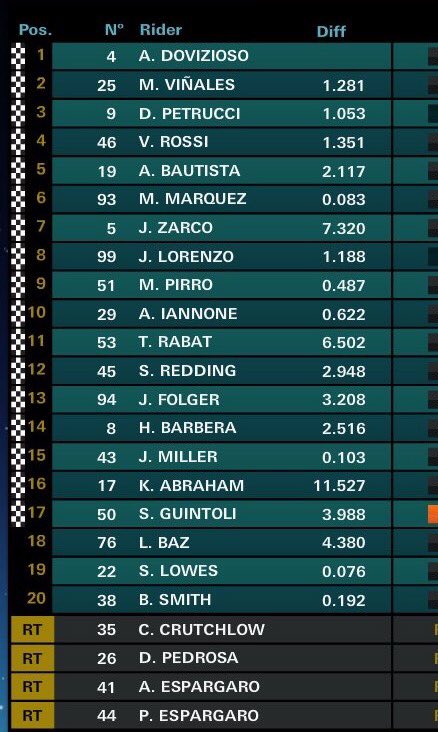 Last… Atas hasil kemenangan di Mugello hari ini Dovisiozo klasemen sementata pembalap pun berubah. Posisi pertama tetap dipegang oleh Vinales dengan 105 poin disusul Dovisiozo di tempat kedua dengan 79 poin Valentino Rossi di tempat ketiga dengan 75 poin serta Marquez di posisi empat dengan 68 poin.
