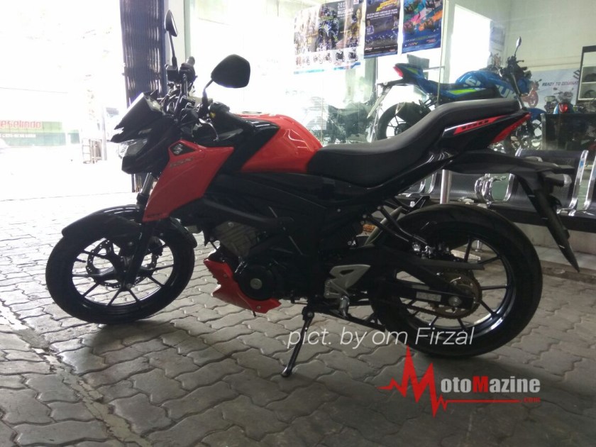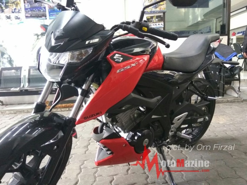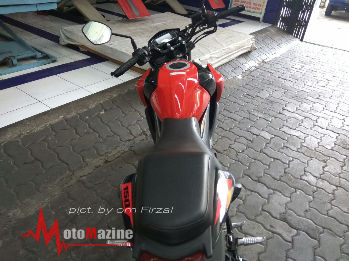 Adalah om Firzal yang telah sukarela memberikan hasil jepretannya.. (suwun sam), mengenai sebuah penampakan GSX-S150 yang telah mengalami modifikasi dengan mengganti jok model split nya dengan model tandem yang lebih tebal dan lebar tersebut. Tak hanya mengubah model dari seat saja, namun pihak Suzuki SMG Madiun yang mempunyai insiatif untuk memodifikasi salah satu motornya ini sekaligus juga menanamkan headlamp si hyperunderbone tergalak di kelasnya, Satria F150 Fi.