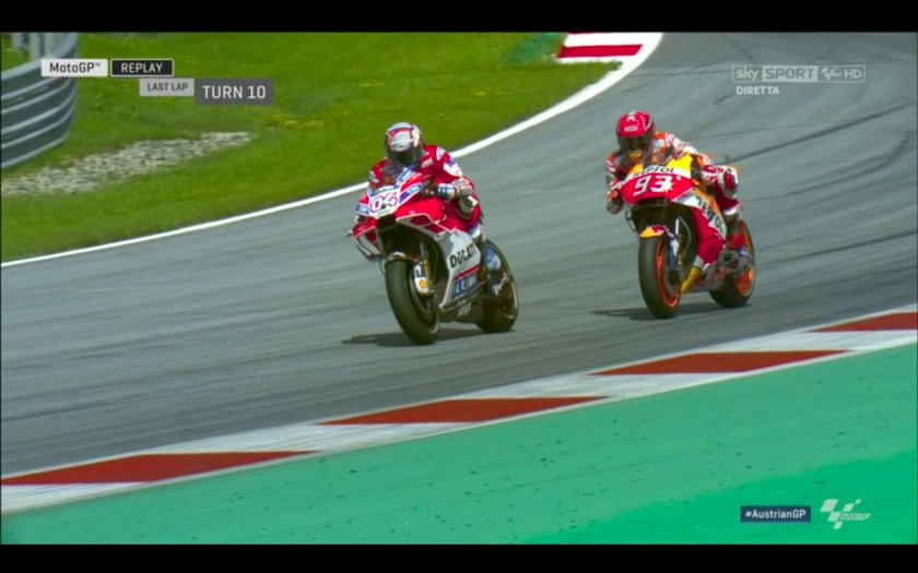 Jelang balap MotoGP Austria masuki lap-lap akhir, Andrea Dovisiozo dan Marc Marquez terus bertarung memperebutkan posisi pertama. Keduanya saling overtaking untuk memperebutkan podium tertinggi.