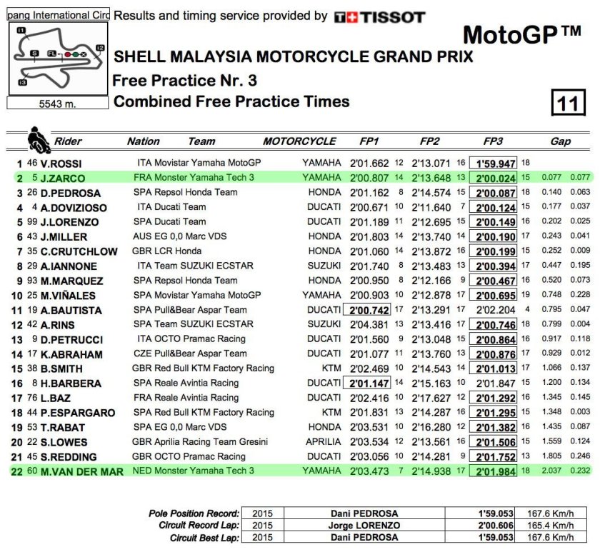 Dani Pedrosa menjadi pembalap tercepat ketiga di fp3 dengan catatan waktu 2m 00.087 detik. Pedrosa terpaut waktu sebesar 0.140 detik saja dengan Rossi.