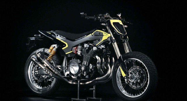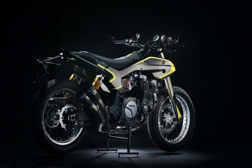 Untuk membalut ban velg 19″ nya, modifikator juga memasangkan ban flat track ala Yamaha TZ750, serta melepas satu cakram depannya.