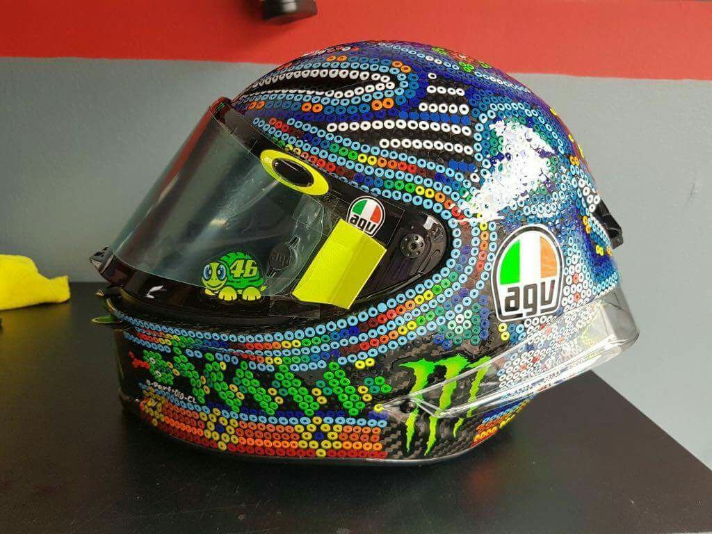 Terinspirasi seni Huichol ini akhirnya Aldo Drudi atas permintaan Rossi menuangkan seni tersebut ke helm The Doctor. Dan hasilnya, ciamik masbro… Helm jadi terlihat beda. Tak seperti desain helm Rossi selama ini yang hanya menggunakan decal, kali ini helm AGV Rossi spesial tes pramusim Sepang 2018 terlihat makin unik.