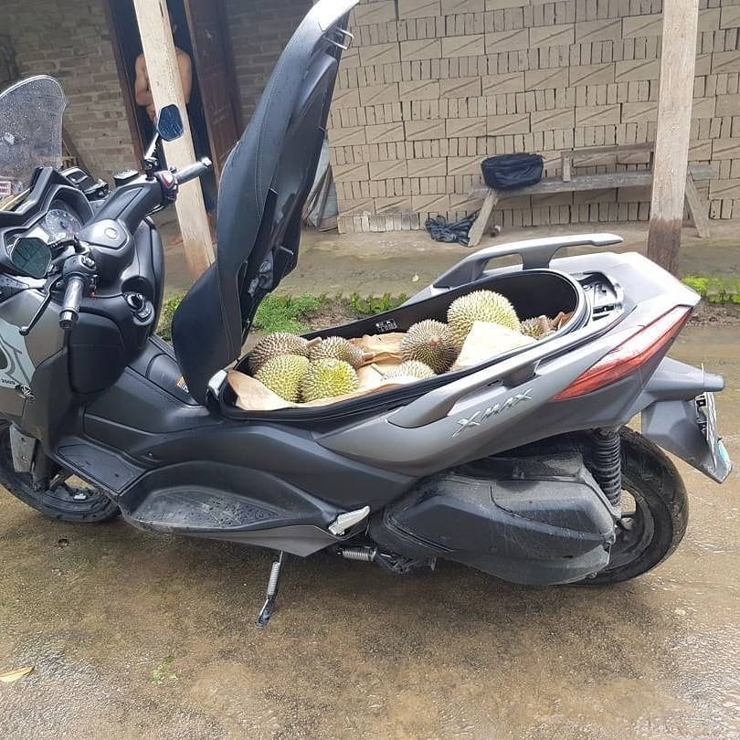 Adalah bro Hawin, salah seorang pemain motor di kota Ponorogo, halah, yang mengunggah foto Yamaha XMAX 250 miliknya dipakai ngangkut duren. Tak hanya satu, tapi ada 15 durian masuk. Wediyan..