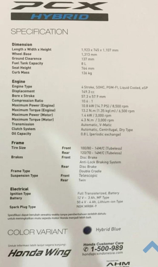 Spesifikasi Honda PCX Hybrid