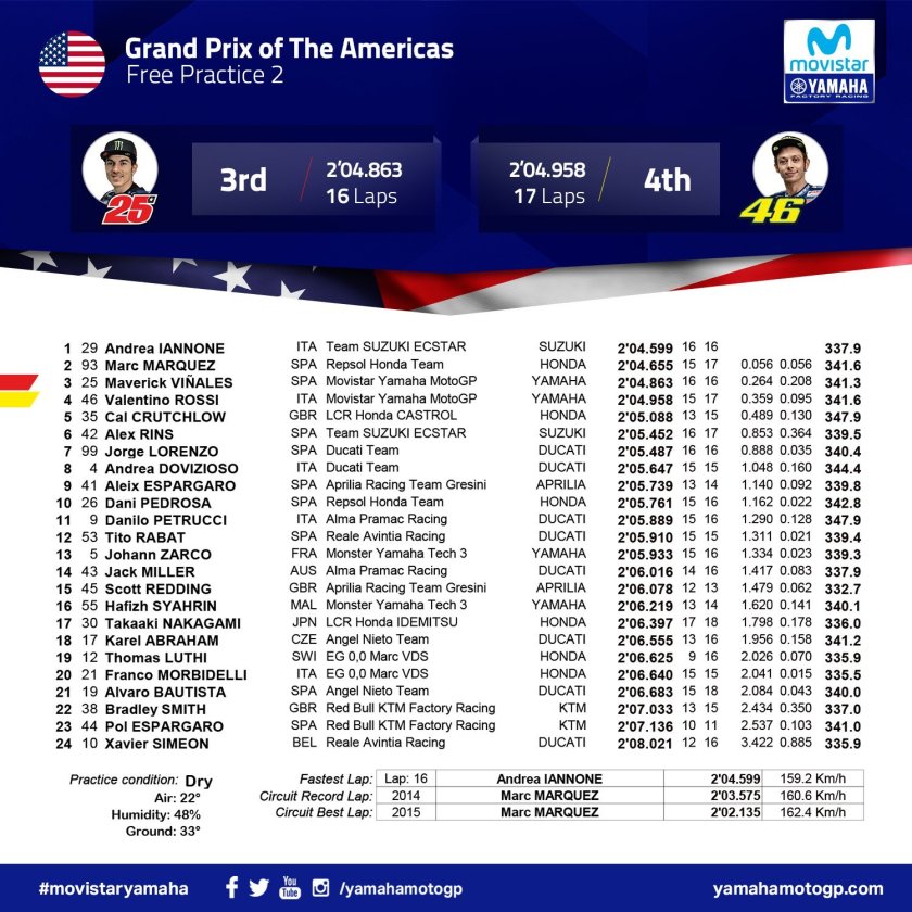 Tepat di belakang Rossi adalah Crutchlow pemenang balapan seri Argentina, disusul Rins, rekan setim Iannone di Suzuki, dan juga duo Ducati yakni Lorenzo dan Dovisiozo yang mengisi posisi 7 dan 8 FP2 MotoGP Amerika.