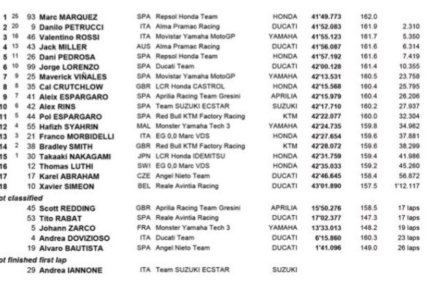 Saking banyak pembalap depan berjatuhan, otomatis Marc Marquez begitu bebas melenggang di depan. Pembalap bernomor 93 ini sama sekali tak tersentuh. Bahkan oleh Petrucci yang ngotot banget pengen ngejar si Marc. Tapi gak apalah, gak bisa ngejar paling gak si doi bisa mengcopy style Marquez 😁. Ini yang ngomong Petrucci sendiri loh.