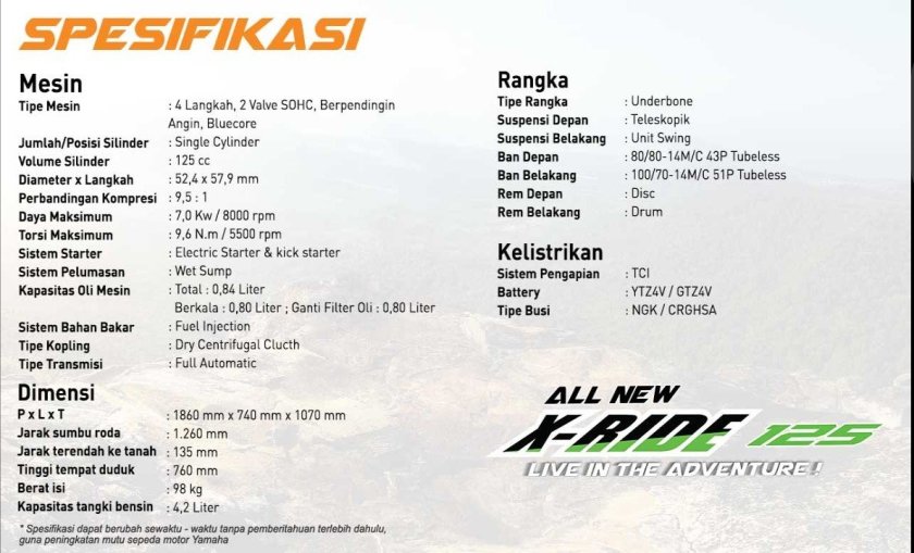 Yamaha New X-Ride sendiri merupakan versi facelift dari pendahulunya. Sebelumnya X-Ride hanya dibekali dengan mesin 110cc karburator yang kini disempurnakan menjadi 125 cc Blue Core berteknologi injeksi.