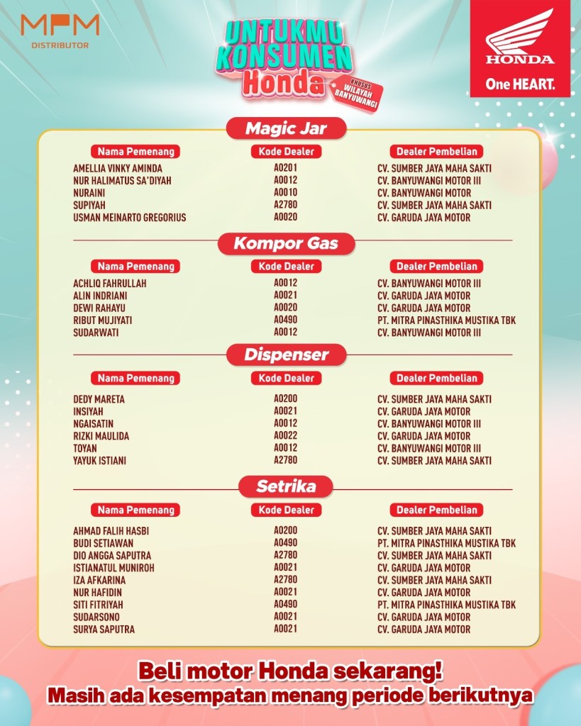 Pengumuman pemenang undian untuk wilayah Banyuwangi telah dilakukan secara live melalui akun Instagram resmi @mpmhondajatim, sehingga seluruh konsumen dapat menyaksikan proses pengundian secara langsung, transparan, dan meriah.