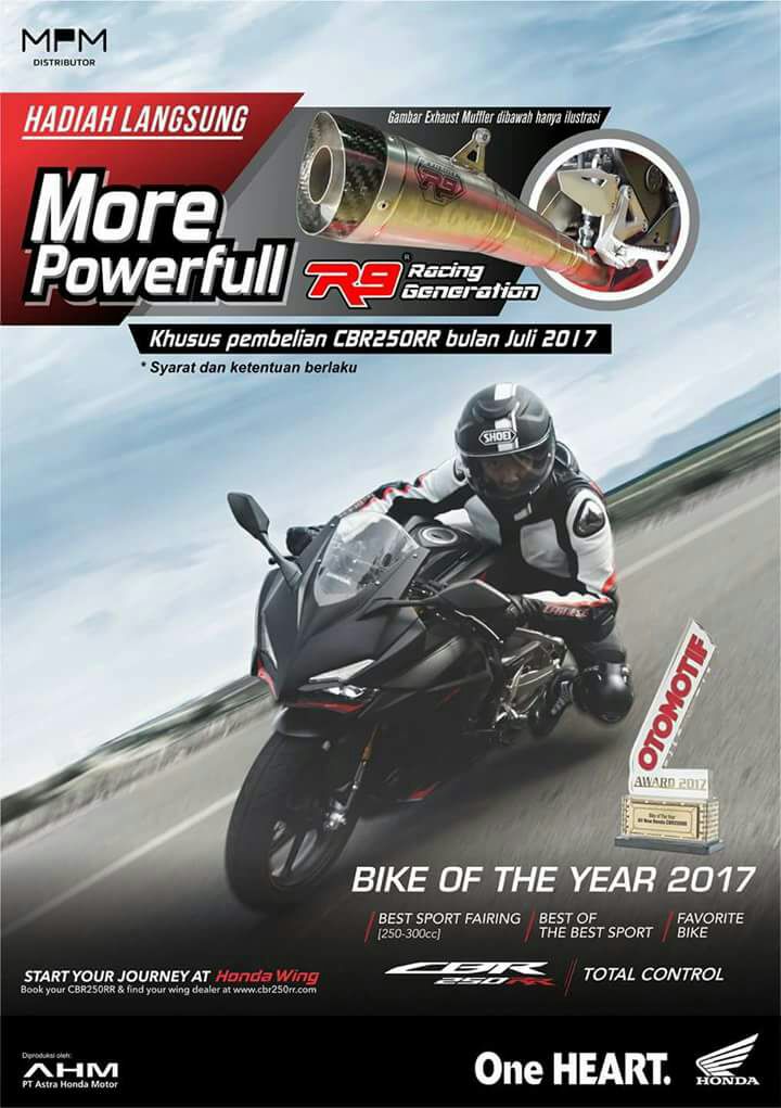 Motomazine.com – Salam safety riding bro sis.. Kesempatan menarik nih, PT. Mitra Pinasthika Mustika (MPM) kembali menggelar promo gratis knalpot R9 setiap pembelian All New Honda CBR250RR di bulan Agustus 2017.