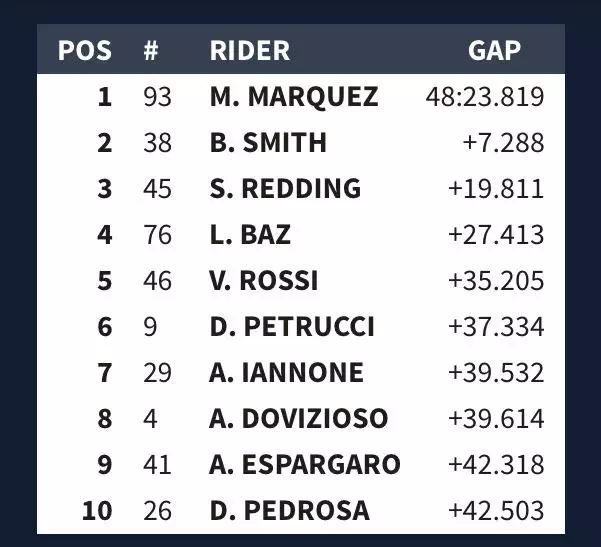 Yup.. Marc Marquez menangi balap semrawut MotoGP Misano 2015. Disusul Smith dan Redding. Sementara Valentino Rossi, sang tuan rumah sekaligus kandidat terbesar pemenang race kampung halamannya ini harus puas berada di posisi lima gegara salah perhitungan pergantian motor.